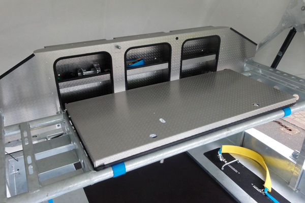 Basculement hydraulique / Système électronique de gestion de la pression des pneus / Kit de sécurité pour roues / Rack pour pneus / Barre antivol de roue / Sangles de roues coiffantes / Sangles de roues « bande de roulement » / Surclassement rampes 2m30 /  Treuil électrique / Treuil manuel / Stockage de carburant / Jantes alliage / Cale roues …